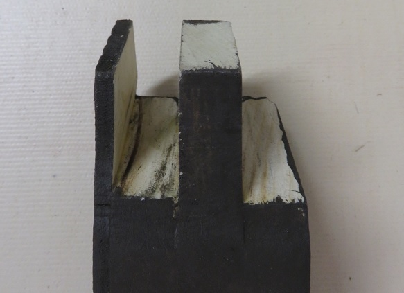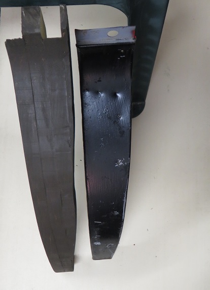 the side that faces the interior part of the car. The right side of the wood member is tapered and fits against the metal body and will need some minor sanding to fit perfectly. The top dimension is 2.5" and tapers to 1.5" at the bottom. To the right of the wood piece is the wheel well metal trim which covers the wooden frame member. |