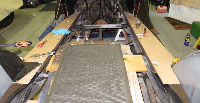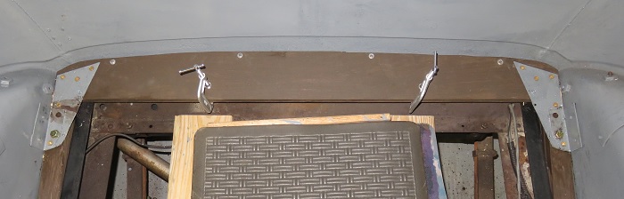 I placed wedges under the posts and installed the first wood section then applied wood glue to the top surface then installed the second piece of wood over the first. I used the four post screws to join the two sections of wood and to join the wood to the metal car skin. I added two clamps to assist with the joining of the wood surfaces.