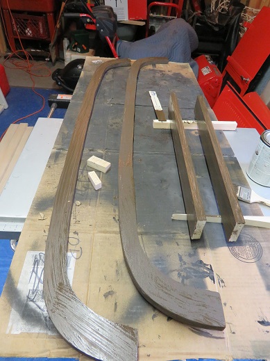 All wood pieces were stained prior to assembly. The center cross members will be glued together once they are installed into the car. The reason for this is to allow for a closer fit to the metal skin and easer assembly. |