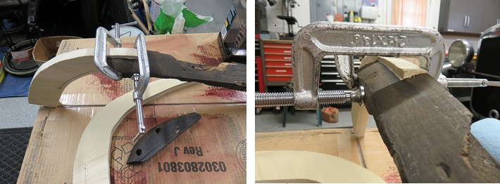 Since only one original chuck existed I needed to reverse the design to facilitate the right side of the car. I created the base piece with the scroll saw, routed the curve by hand and sanded the slope to mimic the slope of the original piece. Below is a picture of the finished product.