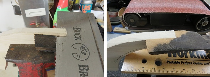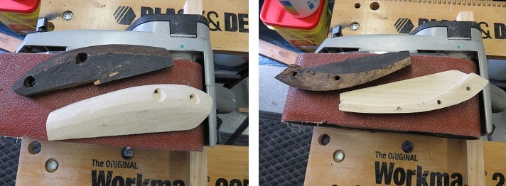 I used a hand saw to trim the excess off. Then I used my floor sander clamped onto my work table as a shaping tool to sand the new wood section flush to the old cross member.