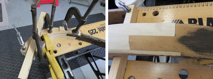 I created two rough ends which I will combine to complete the rotted left section. I am building this piece by first fitting and joining the bottom replacement section then building on the result. This wood member requires a great deal of hand work in order to get this piece correct.