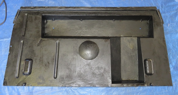 I started with the rear seat's metal pan. This area is used to hold the car's jack and supplied Plymouth tools under the rear seat. As with any metal clean up the pan was scrapped, sanded, and straightened. Since the prior owner performed a substandard floor refurbishment, the need to adjust this pan back to it's intended use added to my time to complete. The good news is that even though the prior repair work left much to be desired, I have to thank the prior effort because these metal parts were cleaned and painted which helped to preserve them for me. The picture below is the results of my work.