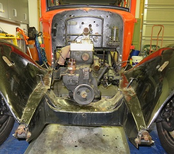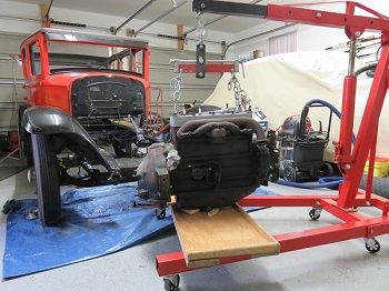 The engine removal went off without a hitch. Once the rear bell housing cleared the mounting hardware it was a small turn to the left and the engine cleared the steering box without any undue effort.