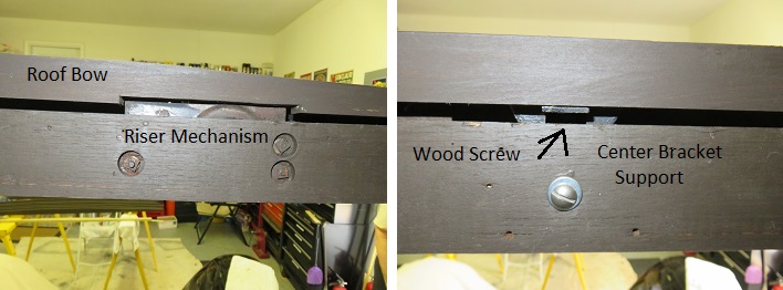 This bow is throw bolted to the cowl corner brackets. There is also a center metal support which supports the Windshield riser mechanism and provides center support for the roof bow. I believe the center machine bolt is also used to hold the rearview mirror in position.