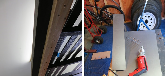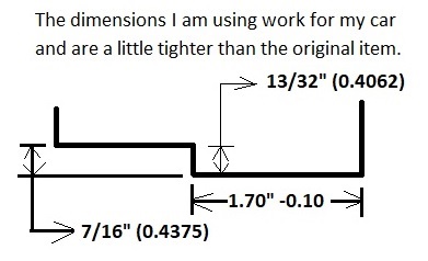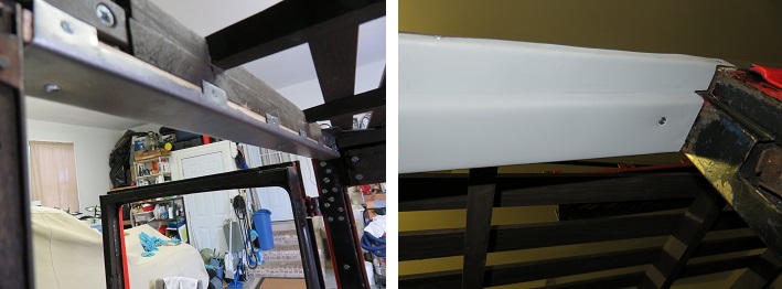 My first step was to install a wood backing for the door frame offset. See picture below on left. Once this was completed I cut a 1 3/4" (1.750") wide section of metal to fabricate section 'A' ( see diag. above.) Attention had to be paid to the over lapped steal edge which joins together with the rear door frame at the center of the door column. Once the piece was properly fitted into place a pencil line was drawn to create the bent flange that wraps around the roof rail.