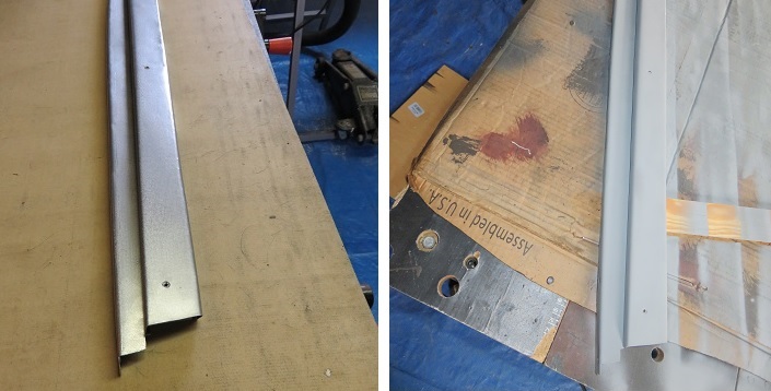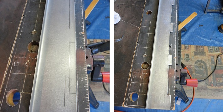 Once completed, I started on section ' B '. This is the part that will wrap around the wood offset creating the stepped door frame. Once the length of the piece was fitted to match the exact dimensions of my door frame I used the brake to bend the first edge that wraps around the wooden offset. See picture below on left. I marked the piece for the inner roof frame. I then marked and cut the steel sections which will create the mounting tabs. Once all the tabs were cut out I then bent the rear to complete section ' B '.