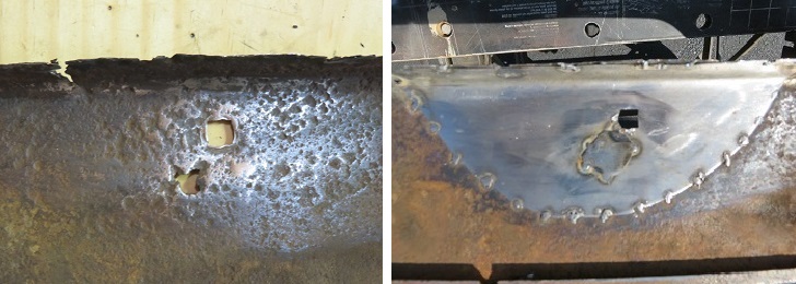 The picture below on the left is the area directly in the center of the panel under the radiator. The rim was rusted by years of radiator fluid leaks and weather. I needed to create a rather large patch that also redefined the folded edge below the radiator. I laid out the piece and used my sheet metal brake to add a half inch rounded edge. Since there was a slight arch to the metal I cut the arch prior to bending the edge. The picture on the right is the result.