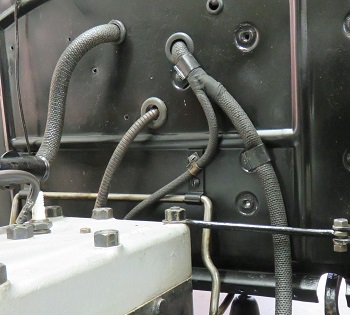 complete the power connection to the light switch. I then proceed to snake the rear harness section down the inside driver's side frame. Remember my harness is a lot bigger than the stock harness because it contains additional wiring for the flasher system. This work was very easy to accomplish. The harness shares mounting clips with the brake lines. The harness runs from the light switch down the frame behind the battery box. This harness also includes the wires which attach to the brake light switch. The picture to the right shows the dash harness meeting up with the harness for the rear lights. |
