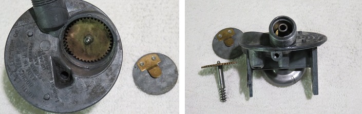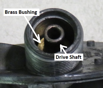 I could influence. I decided to tap the drive shaft down which will in effect move the bushing to a higher point on the drive shaft. Assuming that the bushing is bottomed out in the casting. Since this assembly is pot metal I held the assembly in my hands and lined up a punch rod over the drive shaft. I had my son-in-law tap gently with a small hammer. Well after two well placed taps, the shaft moved slightly which freed up the drive shaft. I could now feel some very slight forward and backward movement of the drive shaft. Just enough backlash to spin properly. |