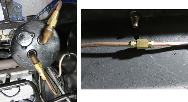 With the gas tank back in the car I finished the gas line to the Vacuum Fuel pump. I decided to mate the original 1/4" copper to a run of the new style copper/nickel tubing to finish the run to the pump. I did this because the line had no leaks and used an old style compression fitting to mate with the fuel tank. Since it wasn't broke I didn't fix it. A code I live by. I also ran a 3/16 copper/nickel vacuum line back under the dash to supply a vacuum wiper motor for the windshield. This is an important item in order to get my car approved for driving on state roads.