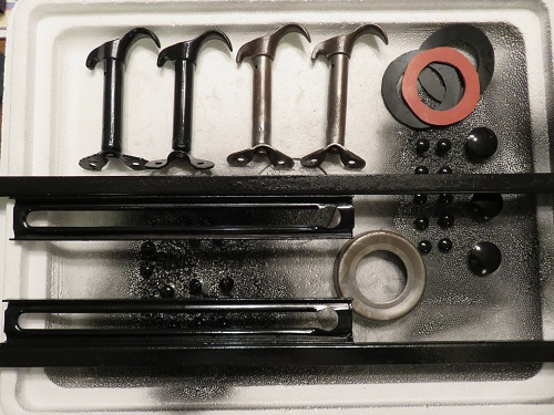 Putting this car back together is a slow and tedious process. Attention to detail is paramount and usually what inhibits progress. It seems that no matter where I turn I'm either missing some minor part that I need to order or fabricate. The big slow down is small parts that need to be cleaned and painted before reassembly. With winter weather it is a lot harder to clean and paint small parts. I have been fairly lucky in that on some days the weather has been flirting with 50 degree afternoons. On days like this I try to get items painted then back into the warm house for the paint to dry and cure. The wife has been especially understanding. Currently there are parts all over the house. The picture below shows an assortment of items waiting for assembly.