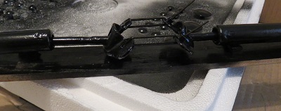hood latches and two cleaned latches. Before I painted the outer coats I forced them open and painted the inner rods. I didn't wanted these rusted steel rods to show when the hood is latched. Details, details. !! |