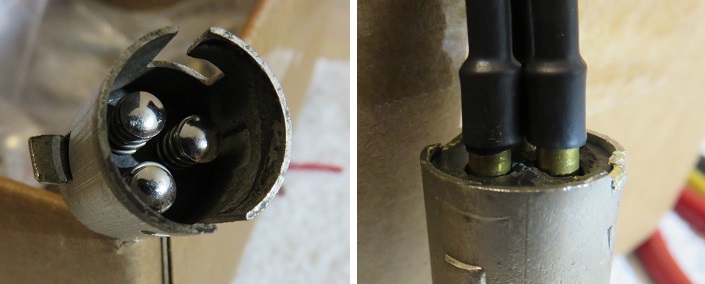 The picture above and to the right shows the rear of the socket with the plug connector installed. All three pins make good strong contact. When the plug is disconnected, the pins will only spring forward until the shrink wrap reaches the Bakelite insulator. This was by no means an easy task and took a good deal of time to repair this plug and socket assembly.