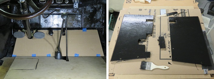 I used cardboard to make two exact templates which I will use to fabricate the 3/4 inch plywood I am using for the toe board. This is what I had left over from the floor. The edge angles were 8 degrees off center and the toe board to floor angle was approximately 131 degrees. My saw gauge is probably off a degree. Of course I cut a piece of scrap wood to check the angles first before ripping the good stuff. The picture above and to the left is my two piece template. The split is between the gas pedal and the high beam switch. Also I am using the section piece in the picture above and to the right above the steering column. Once everything assembled properly I drilled the screw holes and painted the underside of the toe boards.