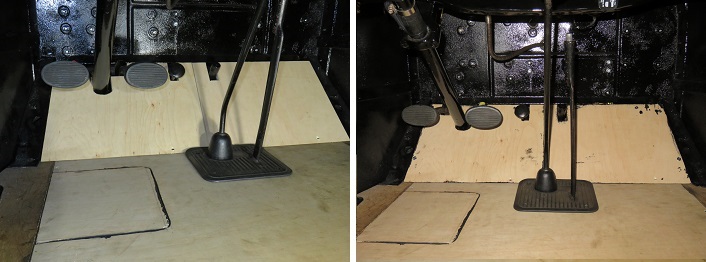 While cleaning and finding parts for the rear seat windows I decided to fabricate and install the toe board. It became obvious to me that with all the pedals and transmission equipment installed, doing this board in one piece would not be a good option for future service removal. Not knowing what the original toe board looked like this is what I did.