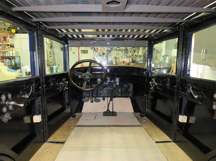With the installation of all the windows and window regulators we ground off the regulator mounting screws and completely cleaned the inside of the car. From this point on the focus is on the restoration of the interior panels, seats, floor, and headliner. My wife and I will be doing all the interior upholstery including the creation of the headliner. I do want the exterior roof surface to be professionally installed but before this can be accomplished the headliner will have to be set in place.
