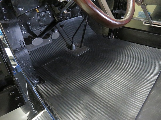Before I painted the floor I chiseled out an indent in the wood floor so that my recently found body plate could reside without any additional damage from being compressed by pressure to the floor. Of course originally it was just tacked to the floor. I left the battery cover unpainted so that I could glue the rubber mat to the battery cover. After the glue dries I will use a razor blade to cut around the wood cover so that the cover can be removed to access the battery without removing the mat. This will also ensure that the mat's pattern will line up perfectly when the cover is closed. Since my battery cover is as large as the battery itself, the battery can be removed from inside the car. Originally you would remove the battery from underneath the car. Very impractical. I don't feel that slight improvements like this, a flasher system, and installing safety glass detract from the historic value of the car but make ownership safer and more practical.