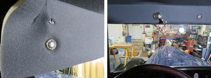 have enough room to turn freely. Originally the headliner was attached to the bottom of the first bow. In order to tension the headliner and increase the width of the finished area a steel strip 1.25 inches wide was nailed to the top of the wood riser assembly. This laid across the gap between the bow and the riser assembly and tensioned the headliner while at the same time increasing the front surface width by approximately 3 quarters of an inch. |