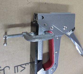 screws. All that was left now was to staple the material to the bottom of the windshield assembly. Since stapling in different places has a tendency to bunch the finish line. I clamped a piece of lath board to the bottom of my stapler to position the staple as close to the back edge as possible. The guide will ensure that each staple is properly positioned. The stapler I am using is a little smaller than the average utility gun. It is a Arrow JT27 using 1/4" JT21 staples. |