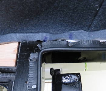 windlace from the 40's to 60's. Since I am using the headliner material to finish off all surfaces, I need to adjust the size of the door board I am using to facilitate a padded edge vs. a fabric edge. This isn't that big of a deal because you would normally pad under standard material. This headliner material comes with its own padding. The edge above the door frame is 1.25 inches wide so I adjusted the diameter to 1 inch. I tried to create a piece long enough to go across both doors but found this to be impractical. |