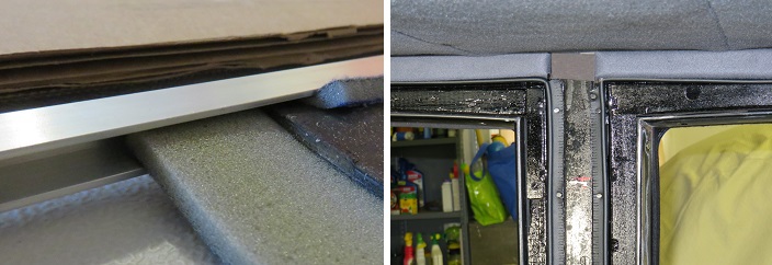 In order to get a nice clean folded edge on both sides of a board only an inch wide with tacks in the center was a little bit of a challenge. I screwed up a number of pieces until I decided to use a quarter inch aluminum 'U' channel to fold the material with glue onto the door board. This not only produced a nice folded edge but when left in place to dry provided the necessary pressure for a good sealed edge. The picture above and to the right shows the results achieved with the 'U' channel.