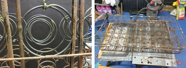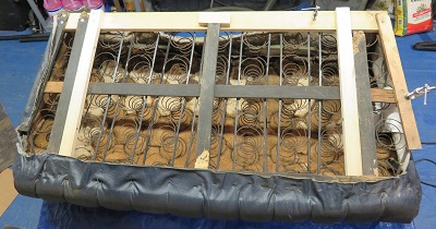 I installed a half a dozen springs to replace one broken spring and five badly worn springs. This resulted in three middle springs on either side of the seat. Once this was done I reinforced the edge wires with 1/8 steel rods which squared the wire frame back into its original shape. I attached the spring cage to the previously made bottom base. Retied the springs and installed a one inch thick extra high density foam layer prior to reinstalling the old seat cover. The picture below is the result of this work.