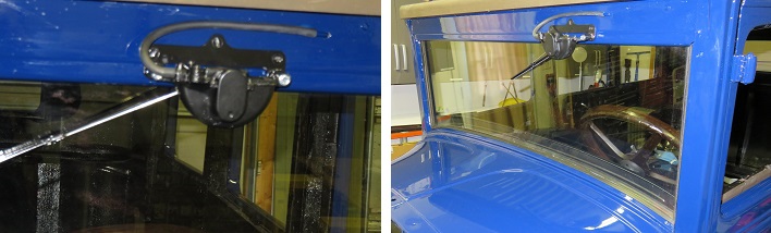 Before installing the front fenders I wanted to work on getting the windshield installed and get the windshield wiper working for the first time. The wiper motor that came with my car is cast iron. I tried to have it repaired but nobody would touch it not even the wiper man. So I am using an exterior mount Trico motor which fits Ford exterior mount cars 1929-31. Also using the same Ford 8" wiper blade and with a 6.750 length wiper arm. The 6 3/4" wiper arm with the 8" wiper blade is perfect for this car. Below is a picture of my original wiper motor on the right and the replacement I am using on the left.