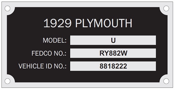 Of course there is always a problem.  I hope to change the Title info to reflect the proper year.  The car was registered as a 1928 Model U Plymouth under the Body Number.  I will not try to change the VIN Number but will try to change the date to reflect the actual correct year.  1929 Model U.  Wish me luck.  How do I explain to the DMV that the car was incorrectly titled in Florida where I purchased it.  I correct the Q to U when I titled it in VA.  So I hope to correct the Year next week.  I had this plate made up for the car to reflect the correct INFO for the DMV and at the same time reflect the proper Fedco Number.  The cost was $42.00.