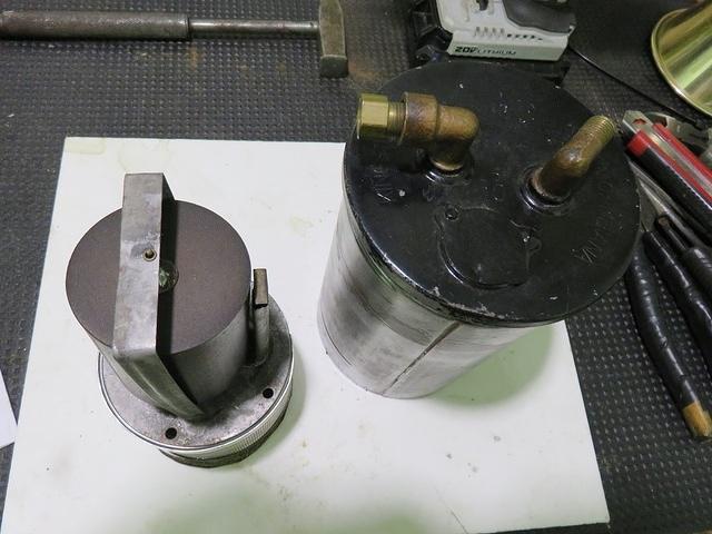 With the top unit apparently ready to  go I worked on the leaky canister.   I soldered all the known areas in need of repair and then, I plugged the bottom hole and filled the canister with water.  I still had a spot that was leaking so I emptied the canister, dried it out and soldered the remaining leaks.  To stress test the canister I filled it with parts cleaner solvent and let it sit overnight in a vice with a paper towel below it.  No leaks the next day so looking good.