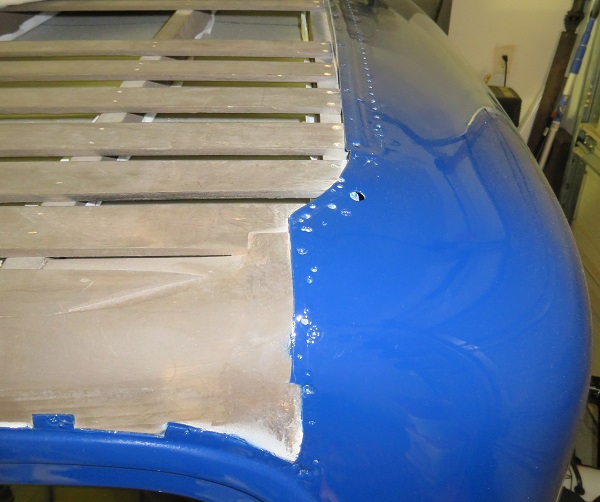 Chet, I'll be watching to see how you tackle this. It looks like some type of padding went over the wood slats and then the exterior roof fabric went over that and was pinched under the trim pieces and cut off even with the outer edge of the trim. I didn't have any of that left except some remnants of the outer fabric which is still under the trim.